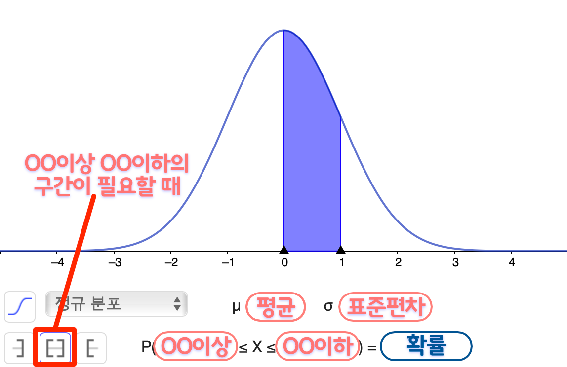 OO이상의 전체 확률이 필요한 경우 아래 세번째 ']' 모양의 탭을 눌러 범위를 바꾼 후 값을 입력해 확률을 구한다.