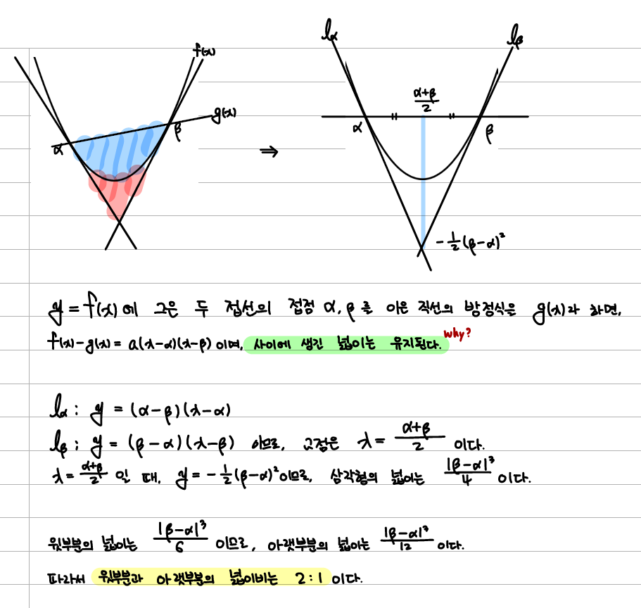 기왕 그림을 그린김에 1등급을 목표로 하는 학생들을 위해 조금만 더 나아가보도록 하겠습니다. 처음에 말씀드렸다시피 포물선은 이차함수를 눕혀놓은 형태입니다. 따라서 포물선과 $\overline{PQ}$로 둘러싸인 부분의 넓이는 공식을 이용해 ${|a||P’-Q’|^3 \over 6}$ 구할 수 있습니다. (단, $a$는 포물선을 역함수나 조작을 통해 $y=f(x)$꼴로 바꾸었을 때, $x^2$의 계수) 그리고 이차함수 밖에서 그은 접선의 성질에 따라 두 접선과 포물선이 이루는 부분의 넓이와 포물선 안쪽에 생기는 넓이는 $1:2$의 비율을 가지므로 안에 생기는 직각삼각형의 넓이는 ${|a||P’-Q’|^3 \over 4}$입니다. 마지막으로 접선을 공유하는 두 삼각형들은 서로 합동이기에 큰 사다리꼴의 넓이의 안에 생기는 직각삼각형의 넓이의 2배이므로 ${|a||P’-Q’|^3 \over 2}$입니다. 이를 이용하면 구하기 어려운 넓이나 길이를 조금 더 쉽게 구할 수 있습니다.