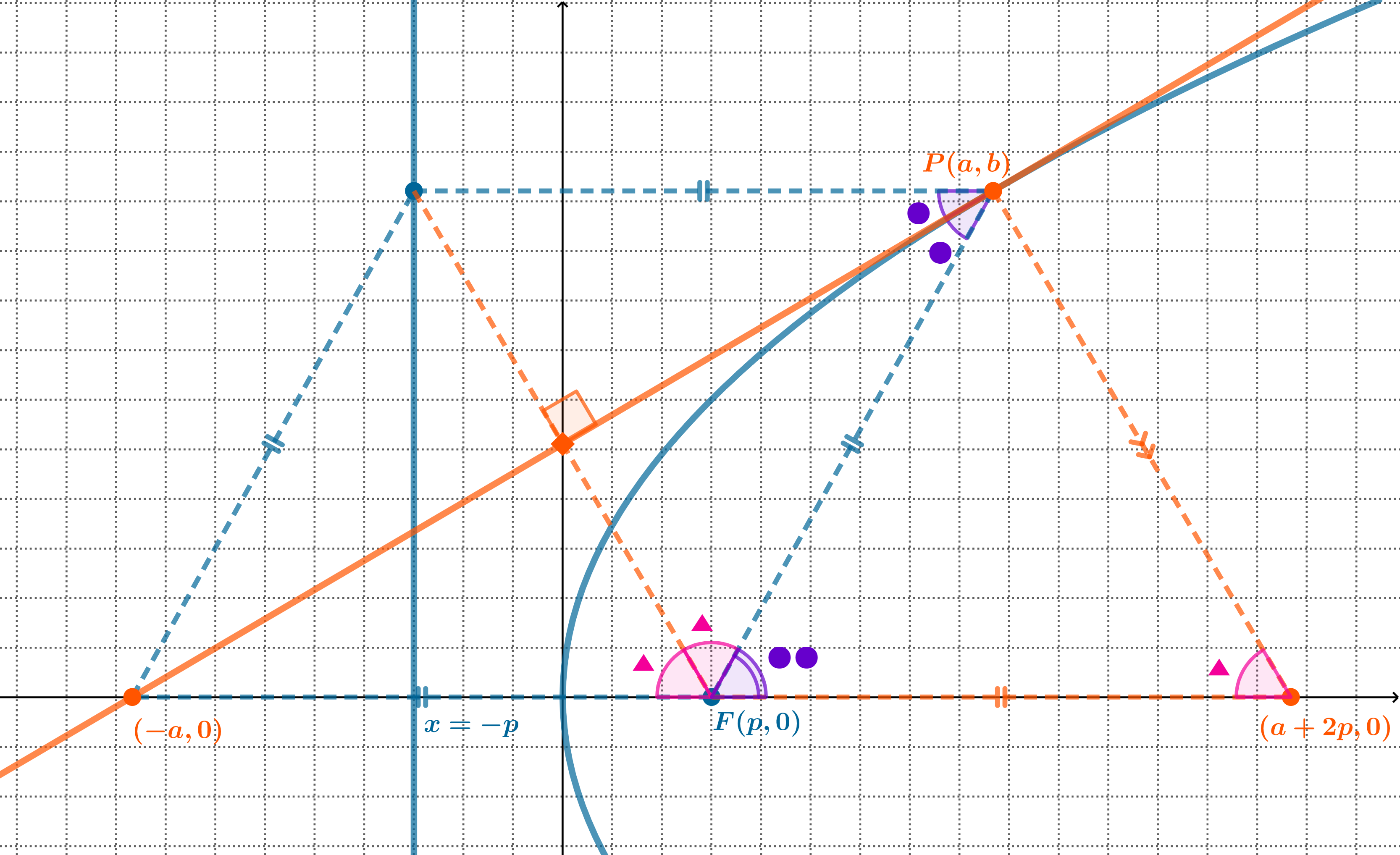 여기까지는 많이 아시는 성질일텐데 조금만 더 나아가보도록 하겠습니다. 다른 대각선을 하나 더 긋게 되면 마름모에 성질에 의해 대각선의 교점은 서로 직교하는데 이 교점은 신기하게도 반드시 $y$축 위에 생기게 됩니다. 그리고 점 $P(a,b)$에서의 법선 즉 다른 대각선과 평행하게 선을 긋게 되면 평행사변형이 하나 생기게 됩니다. 따라서 점 $P(a,b)$에서의 법선의 $x$절편은 식을 통해 구하지 않아도 $a+2p$라는 것을 알 수 있습니다. 이렇게 보면 마름모와 평행사변형이 포개어진 그림이 보이실 것입니다. 이처럼 포물선에서는 평행한 보조선을 많이 그릴 수 있어 자명하게 같은 각들도 찾을 수 있고 이를 응용한 문제도 많이 나옵니다.