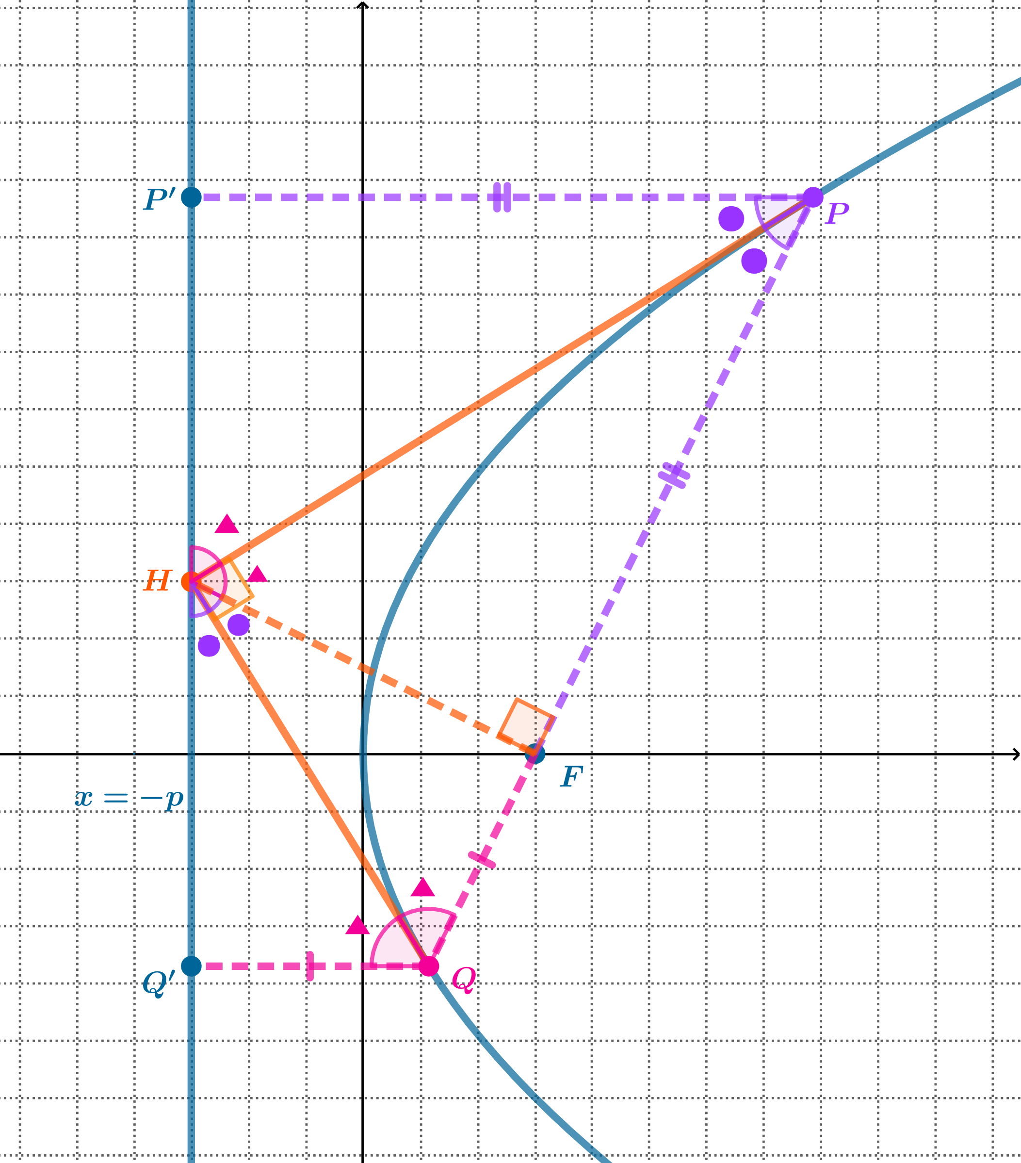 다음으로 포물선의 준선에서 두 접선을 그엇을 때 생기는 성질에 대해 알아보도록 하겠습니다. 그림과 같이 준선위의 임의의 점 $H$에서 포물선으로 두 접선을 그어보겠습니다. 그렇다면 두 접점이 생기게되는데 각각 $P$, $Q$라 두겠습니다. 특별해보일 것은 없지만 점 $H$를 이동해보면 $\angle PHQ$가 항상 일정해 보입니다. 확인해보기 위해 포물선의 성질을 응용해보겠습니다. 점$P$, $Q$에서 각각 준선에 수선의 발을 내린 후 $P$와 $Q$를 이어보면 $\overline{PQ}$를 이은 선이 반드시 초점을 지납니다. 신기하죠? 왜 그런지는 나중에 알아보고 우선 아까 보았던 $\angle PHQ$를 찾아보겠습니다. 그림을 보면 큰 사다리꼴이 있습니다. 사다리꼴의 한 빗변을 기준으로 이웃한 두 각의 합은 항상 $180^\circ$이며 이전에 보았던 접선의 성질에 의해 이 각은 각각 이등분 됩니다. 접선과 $\overline{PQ}$를 포함하는 삼각형에서 $\overline{PQ}$의 양 끝각의 합은 $90^\circ$이므로 $\angle PHQ$은 직각입니다. $\angle PHQ$이 직각임을 알았다면 $\overline{HF}$를 이어 서로 크기가 같은 각들을 확인할 수 있게 됩니다. 각을 찾아보면 네개의 작은 삼각형은 서로 닮음임을 알 수 있고 $\overline{PQ}$와 $\overline{HF}$도 직교함을 알 수 있습니다. 또한 네개의 닮음 삼각형으로 부터 $\overline{PQ}$가 초점을 지난다는 사실도 어렵게 않게 알 수 있습니다.