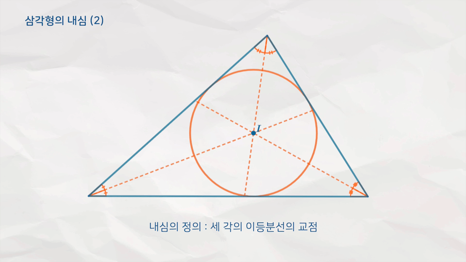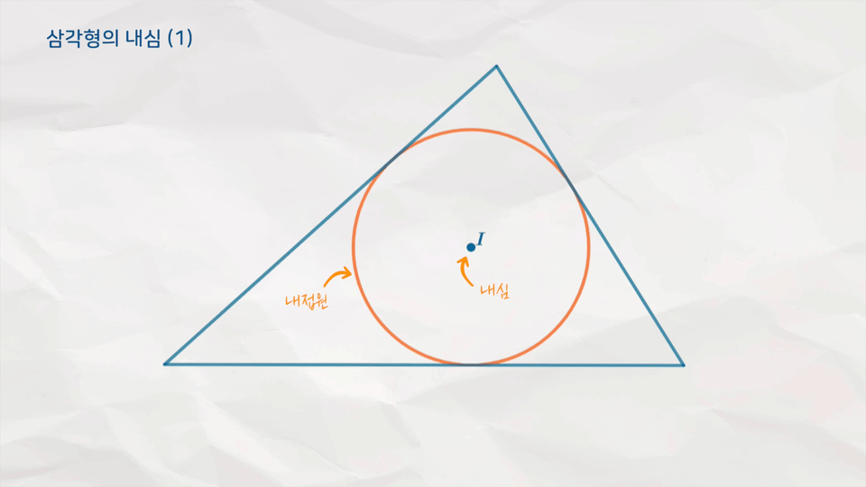 - 삼각형에는 내접하는 원이 반드시 하나 존재하는데 이 원을 ‘내접원’이라 하며 내접원의 중심을 ‘내심’이라 합니다.