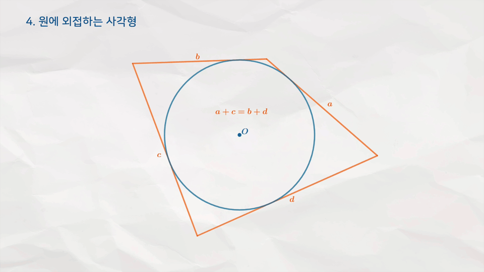 - 사각형이 원의 외접할 때 각 대변의 길이의 합은 같습니다. 또한 원의 반지름이 $r$일 때, 외접하는 사각형의 넓이 $S={1 \over 2}r(a+b+c+d)$입니다. (내접원의 반지름과 사각형의 둘레의 길이를 곱한 값의 절반)