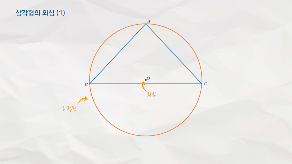 - 삼각형에는 외접하는 원이 반드시 하나 존재하는데 이 원을 ‘외접원’이라 하며 외접원의 중심을 ‘외심’이라 합니다.