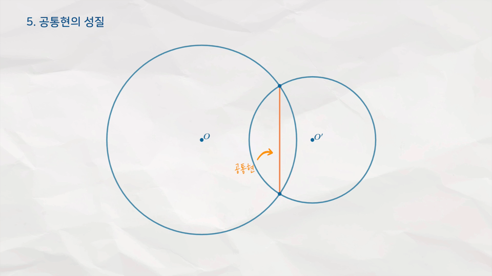- 두 원이 두 점에서 만날 때, 두 교점을 이은 선은 두 원의 공통현이 됩니다. 이 때 두 원의 중심을 이은 선분은 공통현을 수직이등분 합니다.