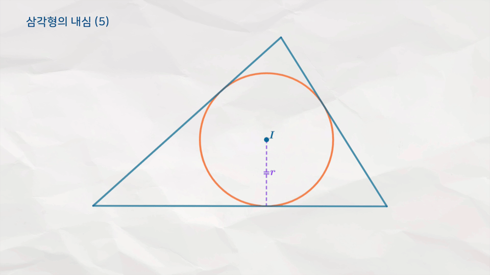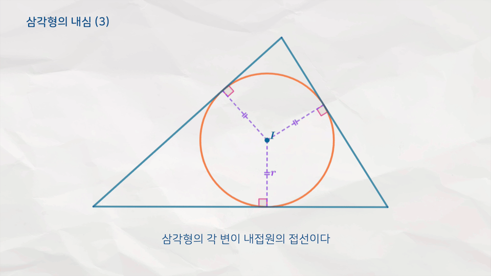 - 내심은 내접원의 중심이므로 내심으로부터 세 변에 수선의 발을 내렸을 때 각 길이는 내접원의 반지름으로 서로 같습니다.