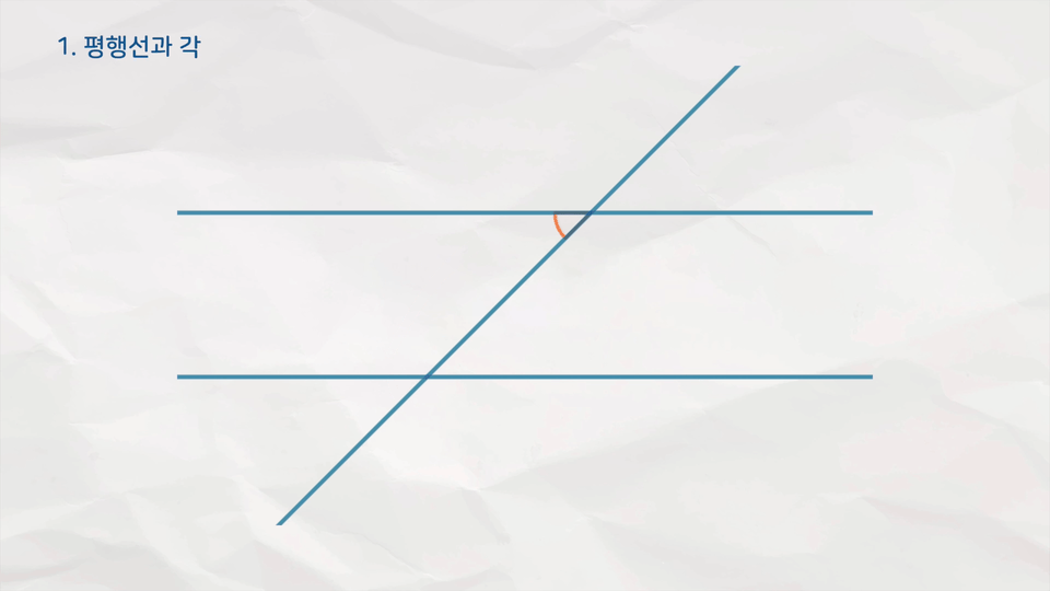 - 평행선과 다른 한 직선이 만나서 생기는 교각 중 한 직선에서 보아 같은 위치에 있는 두 개의 각을 ‘동위각’,서로 반대쪽에서 상대하는 각을 ‘엇각’, 서로 이웃하지 않는 것은 ‘맞꼭지각’이라 하며 이때 이 각의 크기는 항상 같습니다.