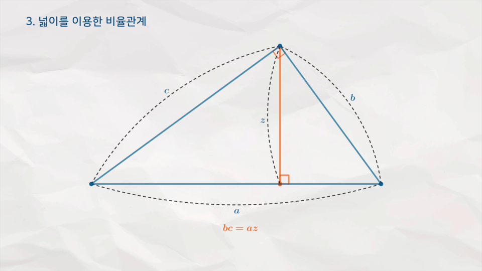 - 넓이를 이용하면 “소” 모양을 따라 생기는 두 선의 길이의 곱은 같습니다. ($bc=az$)