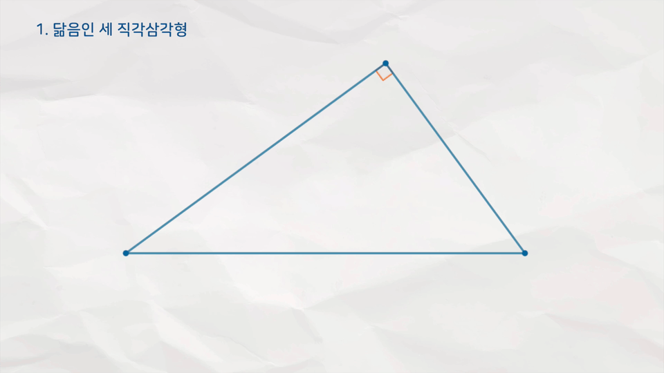 - 직각인 꼭짓점에서 빗변에 수선의 발을 내리면 이 때 생기는 세 삼각형은 서로 닮음입니다.