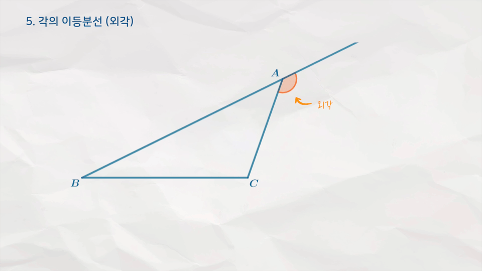 - 한 변의 연장선과 그 이웃한 변이 만드는 각을 ‘외각’이라 합니다. 외각의 이등분선이 마주보는 변의 연장선과 만나는 점이 있을 때 다음과 같은 비율 관계를 갖습니다. ($A$ 외각의 이등분선이 변 $\overline{BC}$와 만나는 점을 $D$라 하면 $\overline{AB}:\overline{AC}=\overline{BD}:\overline{CD}$를 만족한다.)