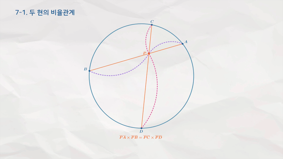 - 원의 두 현의 교점을 $P$라 하면 $\overline{PA} \times \overline{PB} =\overline{PC} \times \overline{PD}$가 성립합니다. 그리고 이는 $P$를 원 밖으로 이동해도 성립합니다. 이를 응용하면 원 밖의 한 점 $P$에서 그은 접선과 할선을 볼 때 $\overline{PT}^2=\overline{PA} \times \overline{PB}$임을 알 수 있습니다.