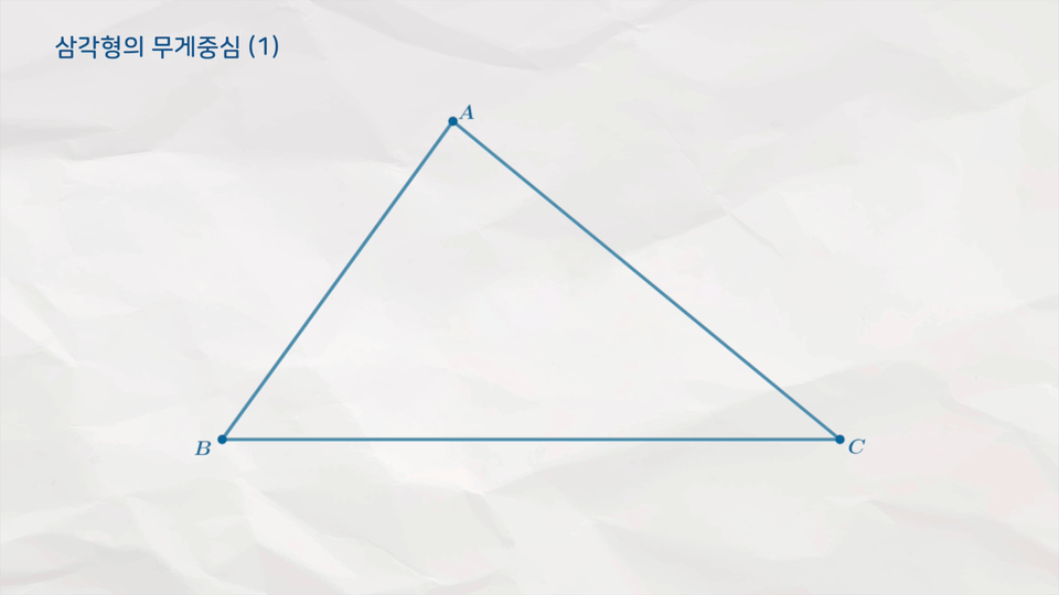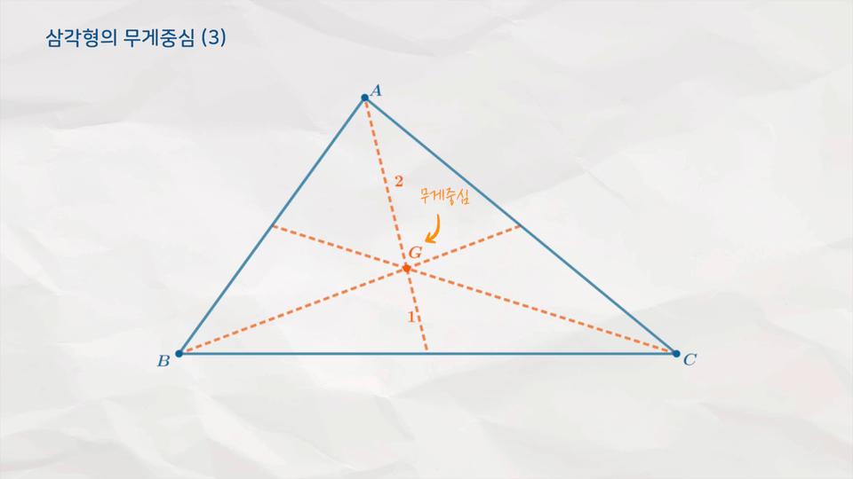 - (정의)삼각형의 세 중선은 반드시 한 점에서 만나게 되는데 이 점을 ‘삼각형의 무게중심’이라 합니다.삼각형의 무게중심은 각 중선을 꼭짓점으로부터 $2:1$로 나눕니다.