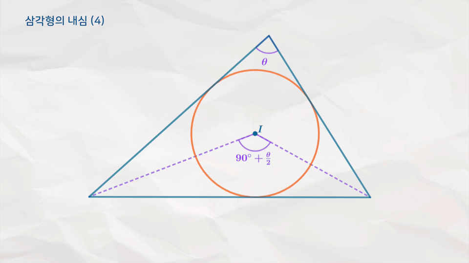- 내심에서 각 꼭짓점으로 이은 선끼리 이어서 만든 각은 대응하는 각의 절반에 $90^\circ$를 더한 값과 같습니다.