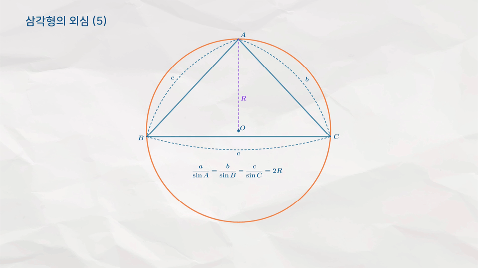 - 외접원의 반지름을 $R$이라 하면 사인 법칙(${a \over sinA}={b \over sinB}={c \over sinC}=2R$)을 만족하며 삼각형의 넓이는 $S={abc \over 4R}$로 구할 수 있습니다.