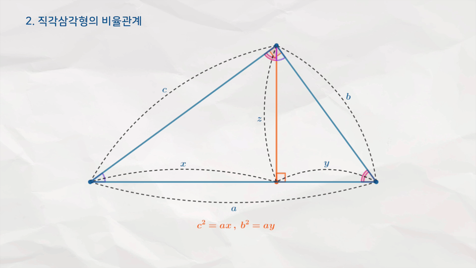 - 이 때 비율관계를 응용하면 빗변에 생기는 짧은 선과 빗변의 길이의 곱은 대응하는 변의 길이의 제곱과 같습니다.($c^2=ax$, $b^2=ay$)