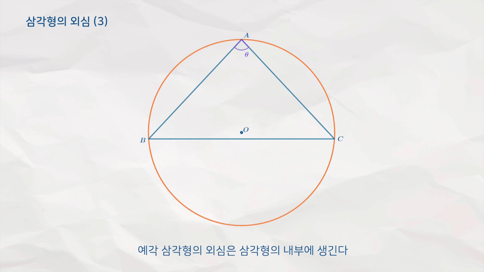 - 예각삼각형의 외심은 삼각형 내부에, 직각삼각형의 외심은 빗변의 중점에, 둔각 삼각형의 외심은 삼각형 외부에 존재합니다.