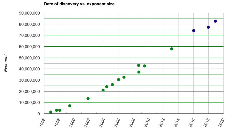 2018-Dec-21 51st Known Mersenne Prime Found! December 21, 2018 — The Great Internet Mersenne Prime Search (GIMPS) has discovered the largest known prime number, 282,589,933-1, having 24,862,048 digits. A computer volunteered by Patrick Laroche from Ocala