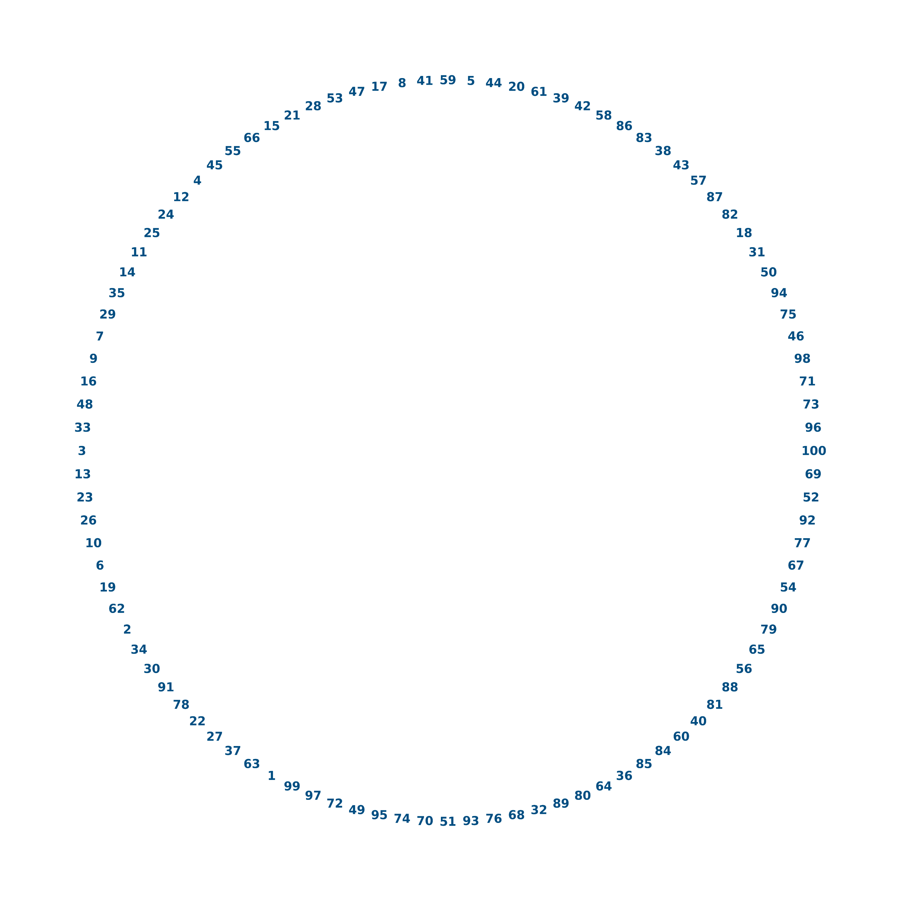 [100, 96, 73, 71, 98, 46, 75, 94, 50, 31, 18, 82, 87, 57, 43, 38, 83, 86, 58, 42, 39, 61, 20, 44, 5, 59, 41, 8, 17, 47, 53, 28, 21, 15, 66, 55, 45, 4, 12, 24, 25, 11, 14, 35, 29, 7, 9, 16, 48, 33, 3, 13, 23, 26, 10, 6, 19, 62, 2, 34, 30, 91, 78, 22, 27, 37, 63, 1, 99, 97, 72, 49, 95, 74, 70, 51, 93, 76, 68, 32, 89, 80, 64, 36, 85, 84, 60, 40, 81, 88, 56, 65, 79, 90, 54, 67, 77, 92, 52, 69]