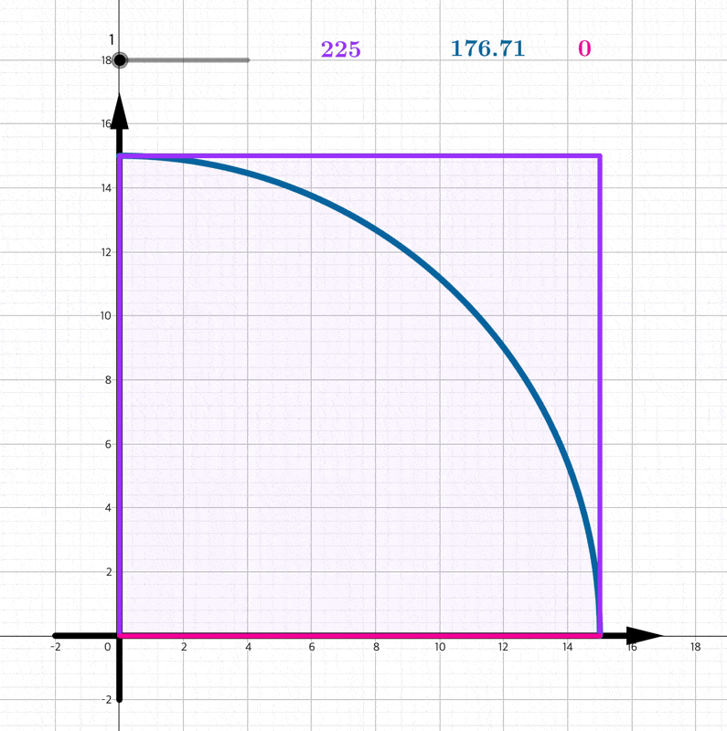 이 GIF는 구분구적법을 사용하여 사분원의 넓이를 어떻게 계산하는지를 단계별로 보여줍니다. 시작할 때, 사분원은 없고 오직 큰 직사각형만이 보입니다. 이 직사각형의 넓이는 \( 15 \times 15 \)으로, \( 225 \) 제곱 단위입니다. 이후에, 구분구적법을 적용하여 사분원의 곡선 아래 있는 부분을 제외하고, 남은 넓이를 계산합니다. 이 과정은 사분원의 곡선 아래의 직사각형들을 하나씩 제거해 가면서 진행됩니다. 최종적으로, 남은 넓이인 \( 176.71 \) 제곱 단위가 사분원의 근사 넓이로 표시됩니다.