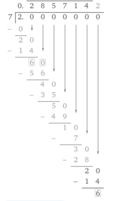 여기서 중요한 점은, $\frac{2}{7}$에 대한 나눗셈이 $\frac{1}{7}$을 나눌 때의 세 번째 단계에서 시작한다는 것을 관찰하는 것입니다.