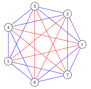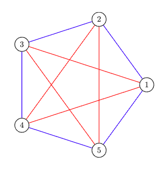 그렇다면, $R(s,t)$는 그래프의 모든 변을 두 가지 색으로 색칠했을 때, $s$개의 꼭짓점이 파란색으로 완전 연결되거나, $t$개의 꼭짓점이 빨간색으로 완전 연결되도록 하는 최소한의 정점 수입니다. 따라서 앞서 보았던 문제 상황은 '$R(3,3)$이 몇 인가?'하는 문제로 바뀌게 되죠.