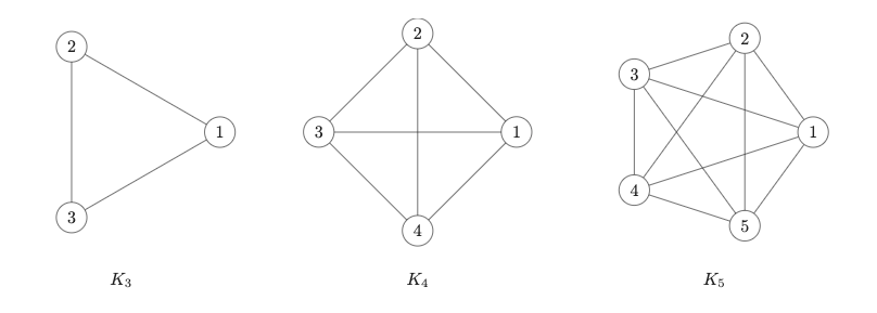 증명에 앞서, 파티 플래너 문제를 수학적으로 재해석해 보겠습니다. 앞선 질문은 질문은 램지 수 $R(s, t)$라는 개념으로 설명할 수 있습니다. 여기서 $R(s,t)$란, 임의의 완전 그래프에서 $s$개의 정점이 모두 연결된 클리크 또는 $t$개의 정점이 모두 연결되지 않은 독립 그래프를 반드시 포함하도록 하는 최소한의 정점 수 $N$입니다.[^2] 여기서 완전 그래프 $K_n$이란모든 정점이 연결된 그래프를 의미합니다. $K_3$는 $3$개의 정점이 모두 서로 연결된 삼각형 모양의 그래프이고, $K_4$는 $4$개의 정점이 모두 서로 연결된 그래프입니다.