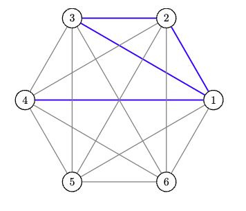 완전 그래프 $K_6$의 특정 꼭짓점에서 나가는 $5$개의 선 중 적어도 $3$개의 선은 비둘기 집 원리에 의해 반드시 같은 색으로 칠해져야 합니다. 왜냐하면 빨강과 파랑 두개의 색에 $5$개의 선을 골고루 배정한다면, 아무리 골고루 배정 해도 하나가 남고, 그 하나는 반드시 두 색 중 하나의 색을 골라야하기 때문이죠. 저는 이 선이 파란색으로 같다고 하고, $2, 3, 4$로 그어보겠습니다.